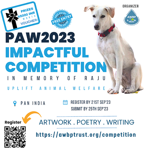 We are happy to announce the launch of the 5th PAN INDIA Competition “PAW2023”, in memory of Raju, the dog who inspired this movement. PAW is a vibrant annual initiative to connect all age groups to animal welfare by showcasing their creative skills like poetry, artwork, and writing. All age groups can participate in this competition under three categories Essay Writing/Artwork/Poetry.